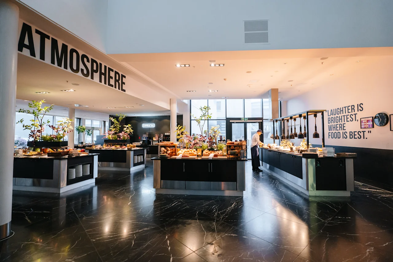 On the first floor, you’ll find The Living Room, where you can settle in after a long day in the city centre or simply enjoy a drink with friends. On the 9th floor, you'll find NÒR Trondheim – an elegant rooftop restaurant offering panoramic views of the fjord and the city. Here, modern European flavors are paired with Nordic ingredients in a setting that truly elevates the experience. For those who want to keep active during their stay, there’s a gym with a relaxation area located right next to the hotel.