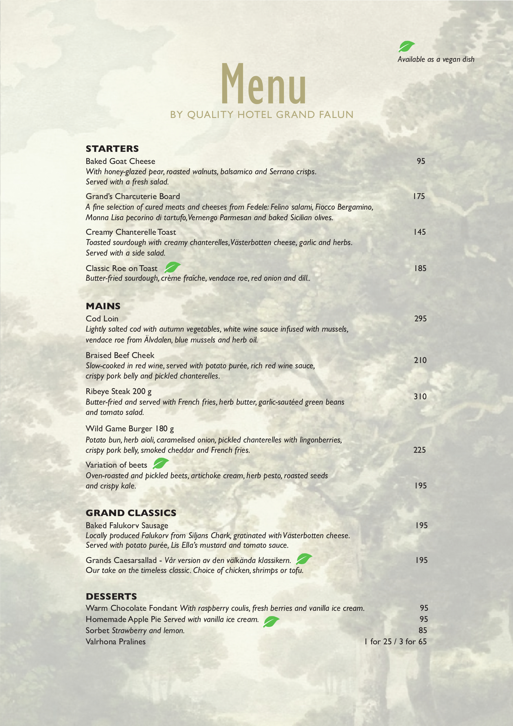 Falun is a distinctive city with a rich cultural heritage, and a UNESCO World Heritage site. Set amidst historic mines and surrounded by beautiful landscapes, at Grands Veranda, you can enjoy steak cooked to perfection, fish that melts in your mouth, or elevated vegetarian courses.